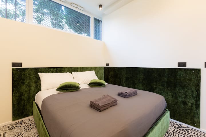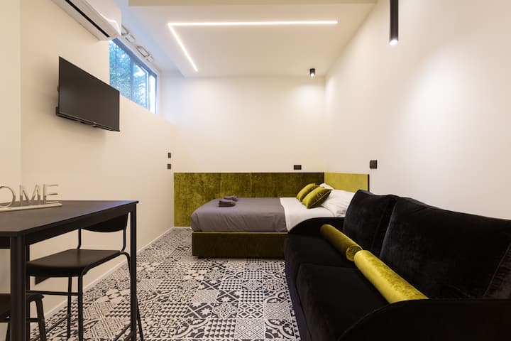 We chose the name Green Room because the main colors dominate: black and green which make our apartment unique.