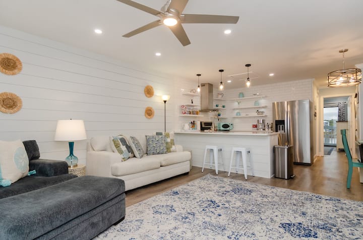 As you enter the condo you are instantly greeted by the bright airy space. The open floor plan maximizes the ocean views and creates a fantastic gathering space. Subway tiles and open shelving line the crisp kitchen and are perfectly accented by the quartz counter tops, stainless steel appliances, and teal touches. Whether you intend to utilize the well-stocked kitchen or enjoy the local area restaurants this kitchen ensures that your every need is met. The living room is lined with shiplap and beautiful hues of blue that seamlessly blend the views with the interior of this home. There is a deck off the living room that overlooks the ocean. Spend hours basking in the sun or grab a cup of coffee and watch the sun rise as your cares melt away.