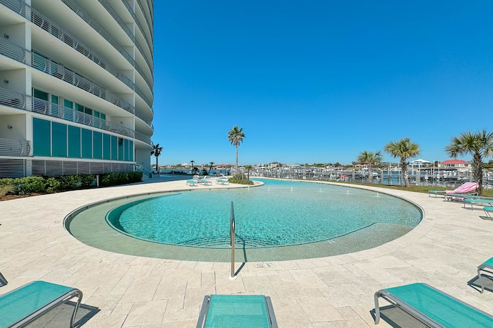 Welcome to Bella Luna 909, a 3-bedroom, 3-bathroom luxury waterfront condo in Orange Beach, Alabama, featuring two outdoor pools, an adults-only pool, an indoor pool, hot tubs, a sauna, a fitness center, and an onsite marina on Old River. Located near the Florida/Alabama state line, this upscale retreat offers stunning water views, modern amenities, and easy access to boating, fishing, and the legendary Flora-Bama.