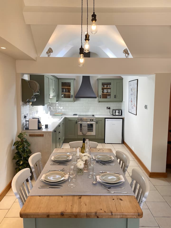 Generous open plan living area with high vaulted ceiling. Dedicated dining space for 4 guests, a cosy living area with 2 seater sofa, two occasional chairs and smart tv. The fully fitted kitchen includes a dishwasher and fridge with ice box, electric oven and hob, Nespresso type coffee machine with initial supply of pods, kettle and toaster. A welcome pack will be provided with a supply, of tea, coffee, milk and bread.