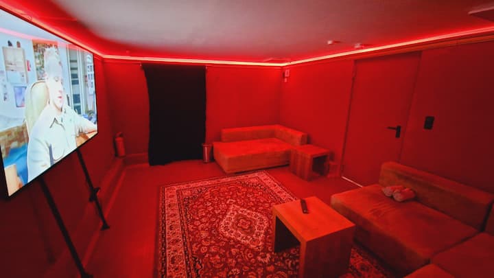 The cinema room has the dimensions of about 400x500, has LED lighting around and in addition bright ceiling lights that can be switched on or off. The couch elements in the cinema room also invite you to snooze. Everything personally tested :-) You can sleep fantastically on the two lounging areas of the sofas in the cinema room (about 90x200cm). These are also the sleeping places for potential 3rd and 4th guests.