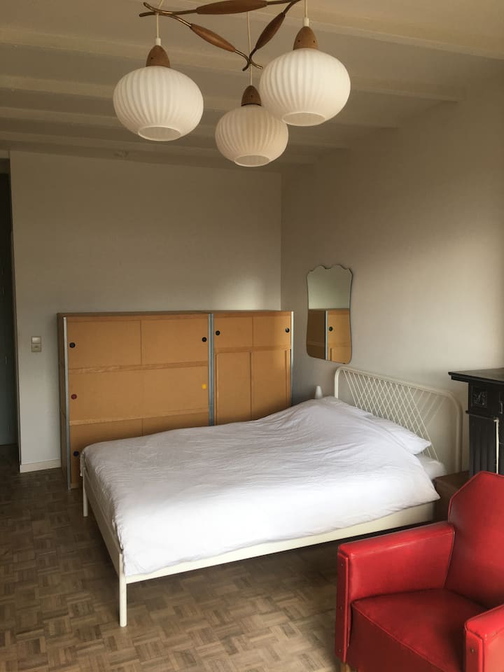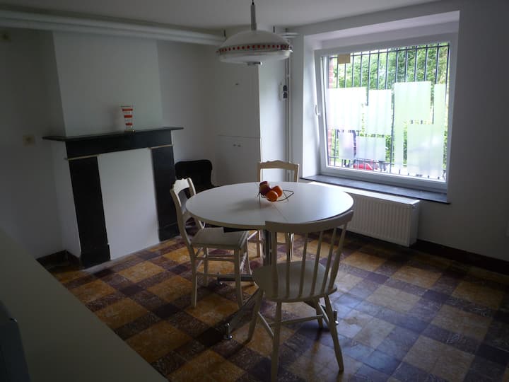 Close to the city center which you can reach on foot by a bucolic trail (20 minutes from Place St Lambert), you enjoy a rural and quiet environment in a popular area, although the train that passes nearby is audible from your room. Your home, bright and decorated with vintage furniture, is spread over 2 levels. On the 1st floor, your large room has a double bed, a seating area with an extra bed, an office area, an adjoining bathroom and offers a beautiful view of the neighborhood (25 m2). The kitchen is installed on the ground floor and includes a kitchenette furniture (2 glass-ceramic stalls + an electric reserve, a fridge and a sink), a microwave, a kettle, a simple coffee machine 2 cups, a percolator, a fruit press, a toaster, dishes and classic utensils. She has a table where it is easy to have her meal at 3. The apartment is only used by you but I sometimes have to cross your kitchen to go to a room in the back and our family also takes the corridor between the 2 levels, essentially leaving the house in the morning and returning in the evening.