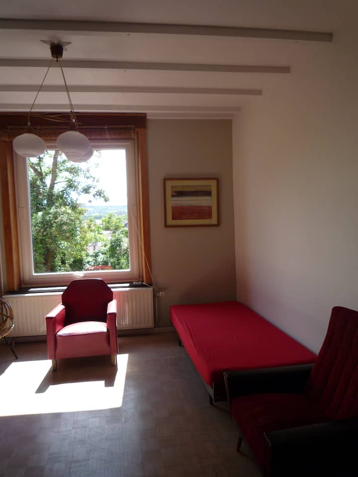 Close to the center of Liège (20'on foot, 10' by bike / bus) and in a countryside environment, this apartment on 2 levels in a family house has a triple bedroom with small living room and ensuite bathroom and a kitchen on the lower level. Wide views of the neighborhood and surrounding municipalities. Starting point for walks on the slopes at 2 steps.