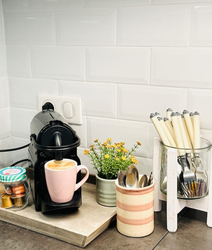 * Kitchen: fridge-freezer, dishwasher, induction hob, hood, oven, microwave, kettle, Nespresso coffee machine with cups, dining and glassware, cutlery, pots, pans, types of tea, sugar, pepper and salt, herbs, olive oil, hand gel, detergent, kitchen towel, dishwasher,...