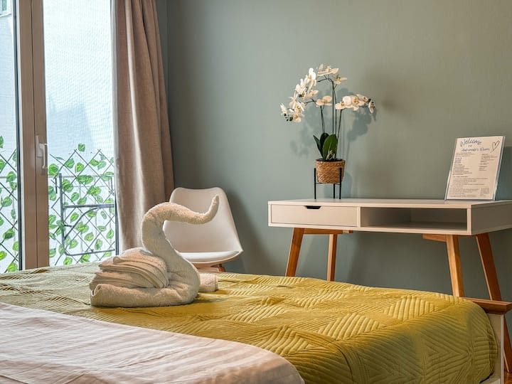 Imagine yourself on the 5th floor of a building, just a stone's throw away from the Siggrou/fix Metro station. Your PRIVATE room, number 3, boasts a comfy Queen size bed paired with premium quality mattress , double-glass windows to ensure that you ll have peace in the most central area of Athens. No need to worry about the Athens heat because each room is equipped with top-notch air conditioning, complete with microbial filters, ensuring you'll always have a peaceful and refreshing stay. Need to catch up on work? No problem! Each room comes with its own dedicated workspace and closet, providing both comfort and convenience. Stay connected with high-speed WiFi internet, and never worry about running out of hot water thanks to our solar-electric powered boiler