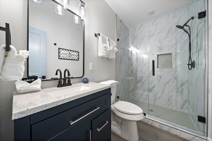 • Each wash station is equipped with a full-size antibacterial hand soap dispenser for your convenience. Additionally, indulge in the luxurious Beekman 1802 hotel-quality amenities, including full-size shampoo, conditioner, and body wash.