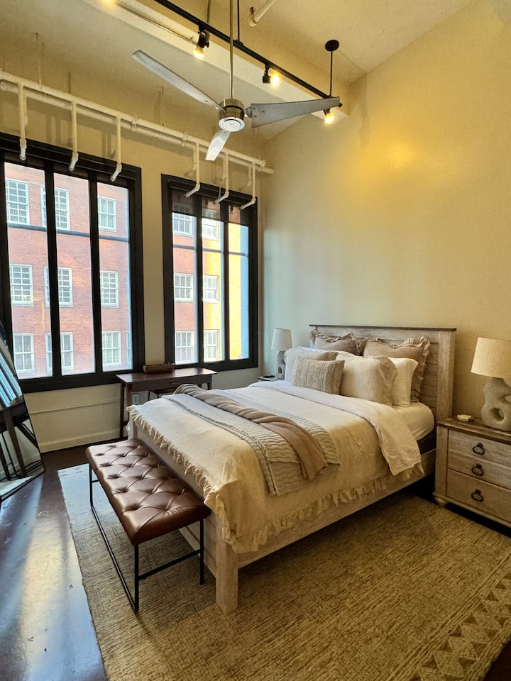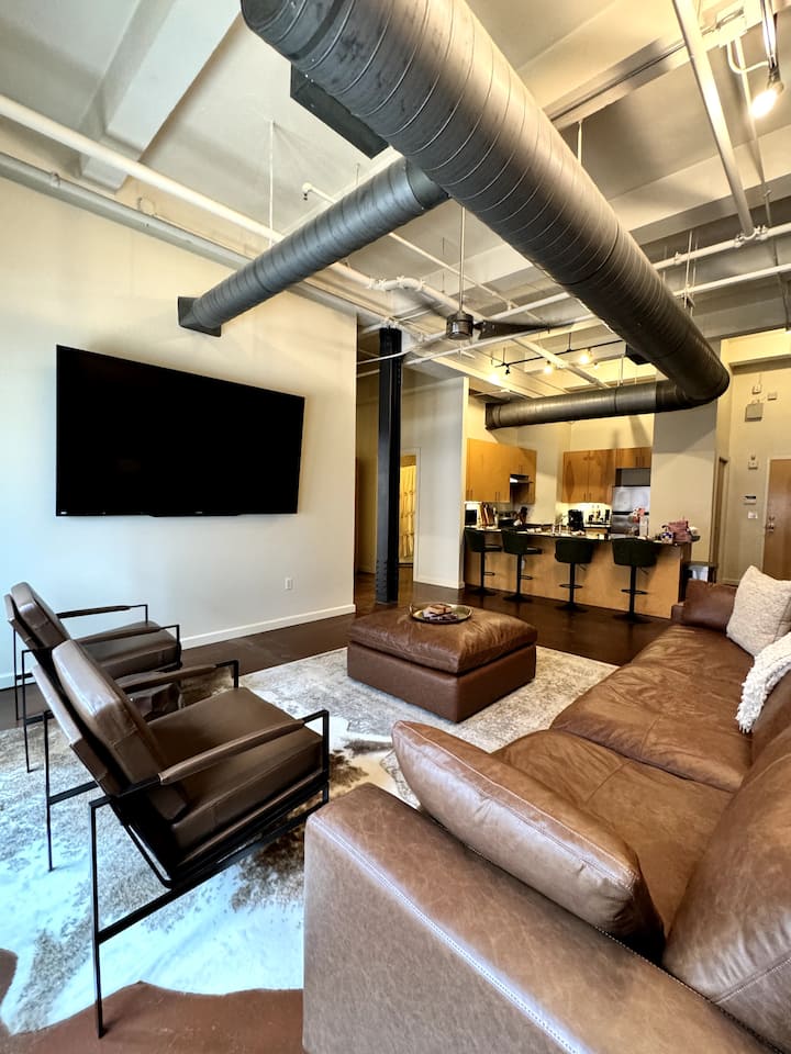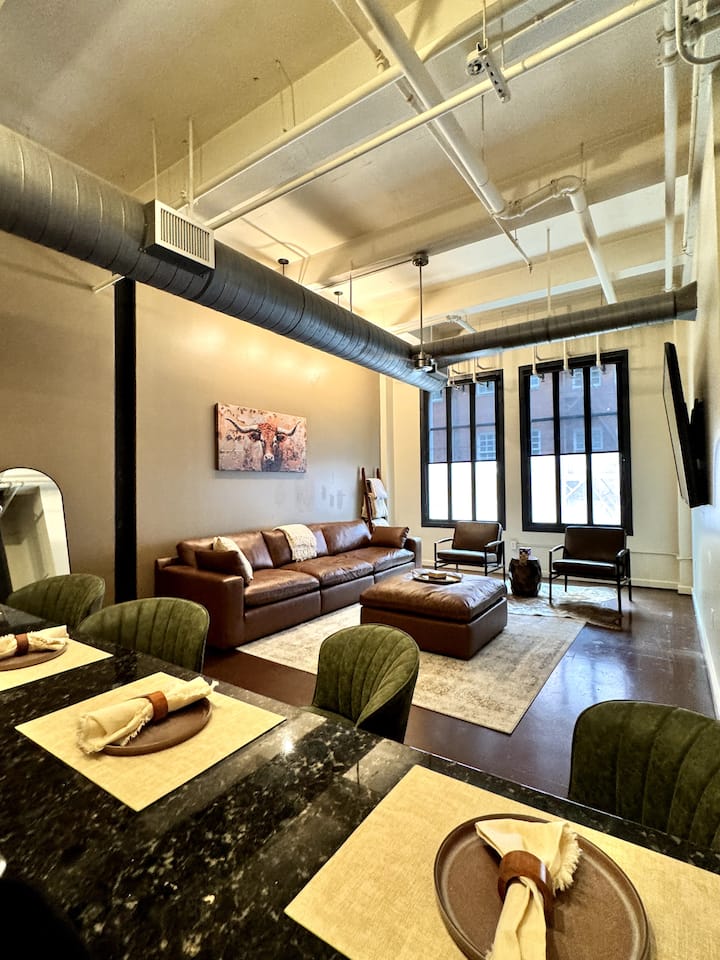 Welcome to our Cowtown-themed one-bedroom in the heart of downtown Fort Worth! Set in a historic 1936 building, the space features 20ft ceilings, large windows, and a fully equipped kitchen. Just 4 blocks from the Convention Center and 2 blocks from Sundance Square, with walkable access to the train station, coffee shops, restaurants, and boutiques. A perfect home base for exploring everything Fort Worth has to offer!