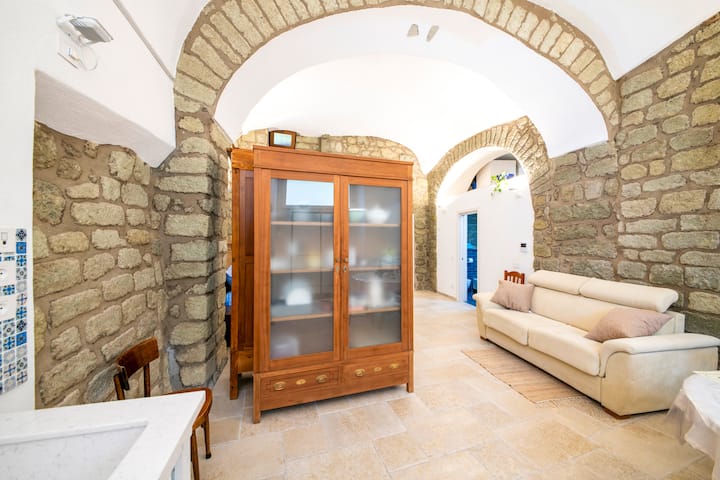 The entire flat is embellished with an authentic and unique design, with stone walls that tell the story of the area's history and traditional architecture.