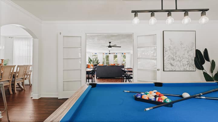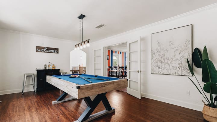 Discover your ideal Gainesville getaway at Gator Oasis, a charming 3-bed, 2-bath home across from UF, perfect for university events. Just 10 minutes from downtown, Shands Hospital, the VA, and North Florida Regional. Not to mention a mere 5-minute drive to midtown. The docile neighborhood encourages walking to all things affiliated with the university! Enjoy easy access to Paynes Prairie and Ginnie Springs. Features include a patio and pool table—perfect for relaxation or entertainment.