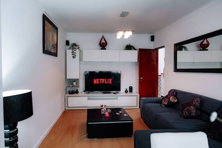 - Living Room and Dining Area: A cozy space with air-conditioning and comfortable sofa, a dining table, ideal for enjoying family meals or planning your day of exploration around the city, flat-screen TV with Netflix and a wide selection of channels, high-speed Wi-Fi ideal for work and leisure and board games for moments of leisure as well.