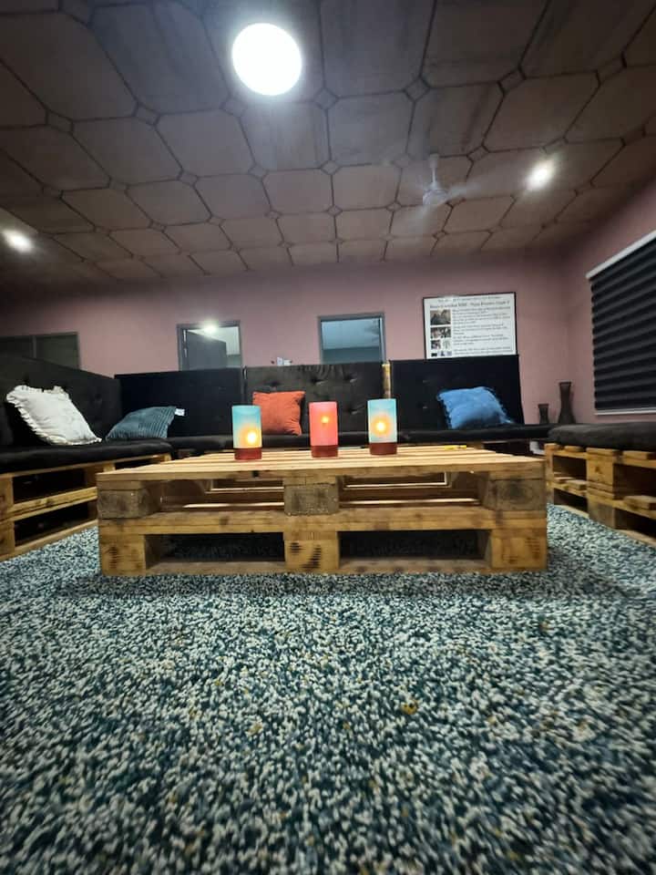 As you walk up the steps and cross the verandah, entering the spacious living area you will find tiled floors and two powerful ceiling fans cooling the room. A large comfortable sofa and coffee table dominate the space, your communal area for eating, drinking, relaxing and playing some of the board games provided. The walls feature display boards explaining the history of the place and the Fairtrade movement.