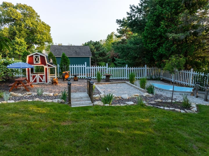 At ChicoryDoorCounty, we think vacationing with kids should be fun, not stressful. We’ve created a unique, natural outdoor play area including a real sunken rowboat for pretend play, a dry riverbed, a pea-gravel truck/digging area, and an adorable barn playhouse with hand-carved wooden farm animals to “feed”.