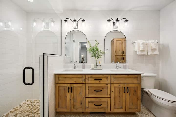 •The primary, main-floor bedroom has a King bed, a stunning walk-in shower with a tile surround and rain shower head, and a double vanity.