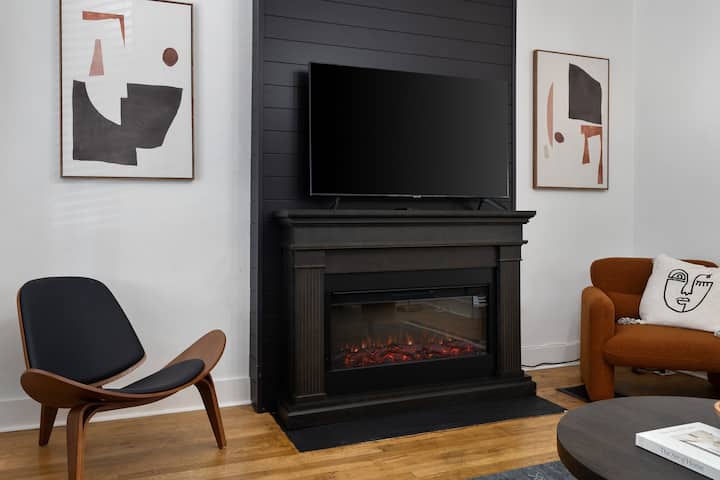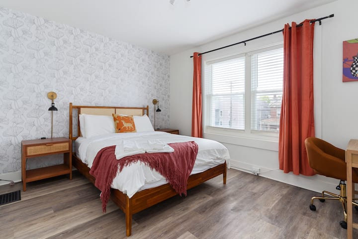 The 'Uptown District' bedroom, situated in our recently renovated house, boasts a modern and clean aesthetic, flooded with natural light. You'll find ample street parking and off-street parking options.
