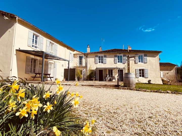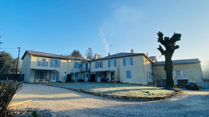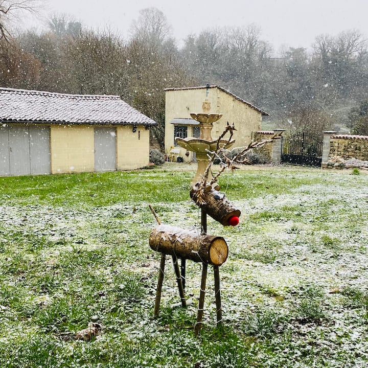 Three linked cottages available as a block booking for Christmas, New Year and Winter breaks. Ideal for friends and larger family groups when you would like to have separate accommodation but be on the same site. Cosy log burners, seasonally decorated, with spacious grounds for a winter stroll. Surprisingly peaceful and within walking distance of cafes, bakeries, supermarkets, a bar/beer warehouse and market. Close to the enchanting villages of Verteuil-sur-Charente and Nanteuil-en-Vallee.