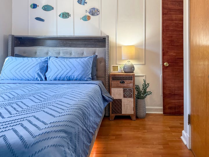This cozy first-floor bedroom features a queen-size bed memory foam bed equipped with two soft pillows and two memory foam pillows. The room is furnished with a closet, a six-drawer dresser, a luggage rack, a smart television, and room-darkening shades to enhance comfort and convenience.