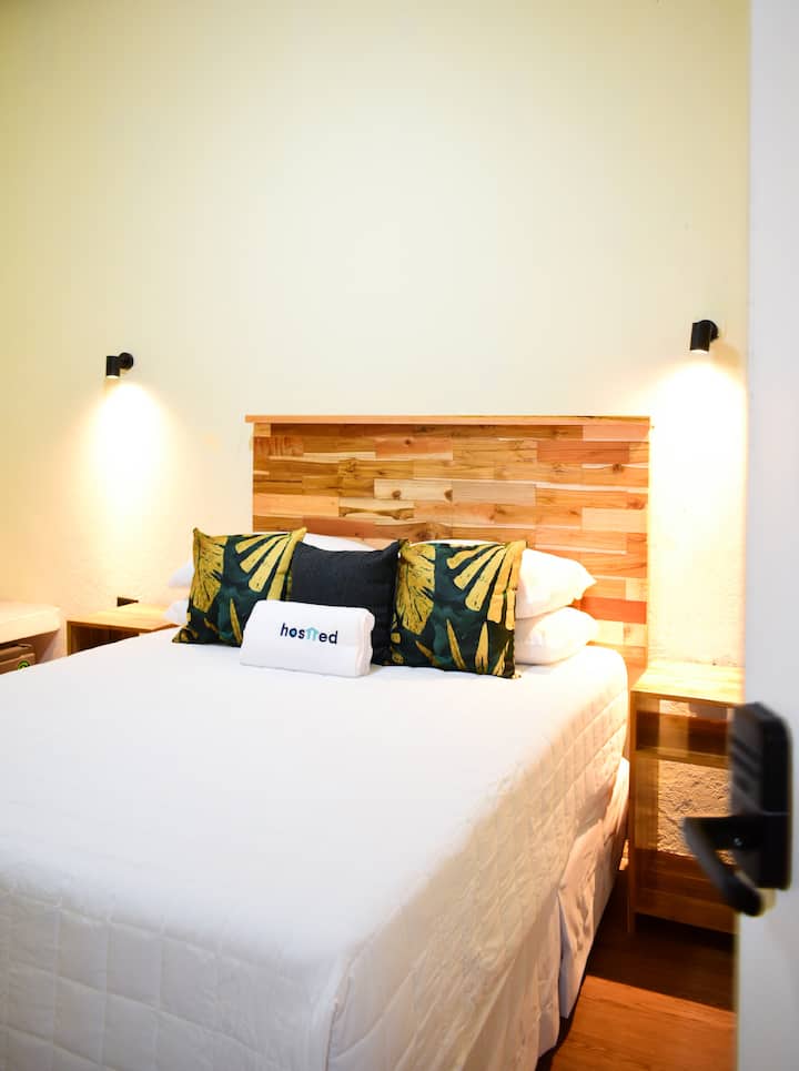 This air-conditioned private room sleeps 2 people comfortably in a queen-size bed and a private fully – renovated bathroom.