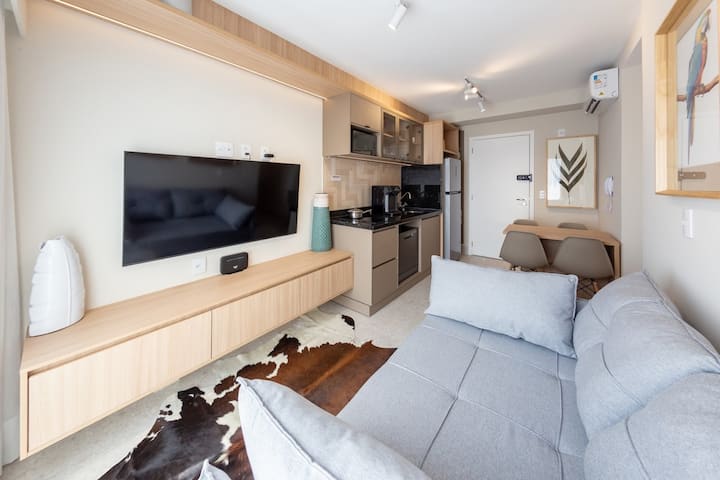 The living room is an invitation to relaxation, equipped with a double sofa bed, perfect for quiet nights or a lazy afternoon watching your favorite programming on TV with open channels. The air-conditioned environment ensures comfort, and the blackout curtains provide total privacy, allowing you to adjust the natural light to your preference.
