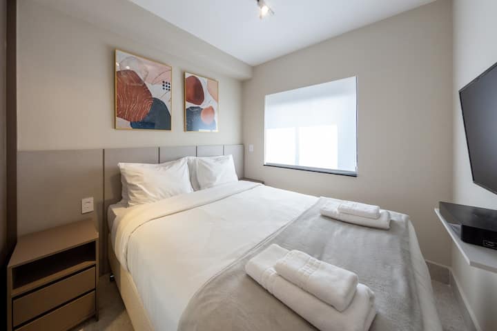 In the master suite, you will find a queen-size bed, ready to provide you with restful nights of sleep. The windows have a full light seal, allowing you to enjoy uninterrupted rest. In addition, the full-length mirror and TV with open channels complement the environment, making it not only comfortable but also practical for those who like to relax in style.