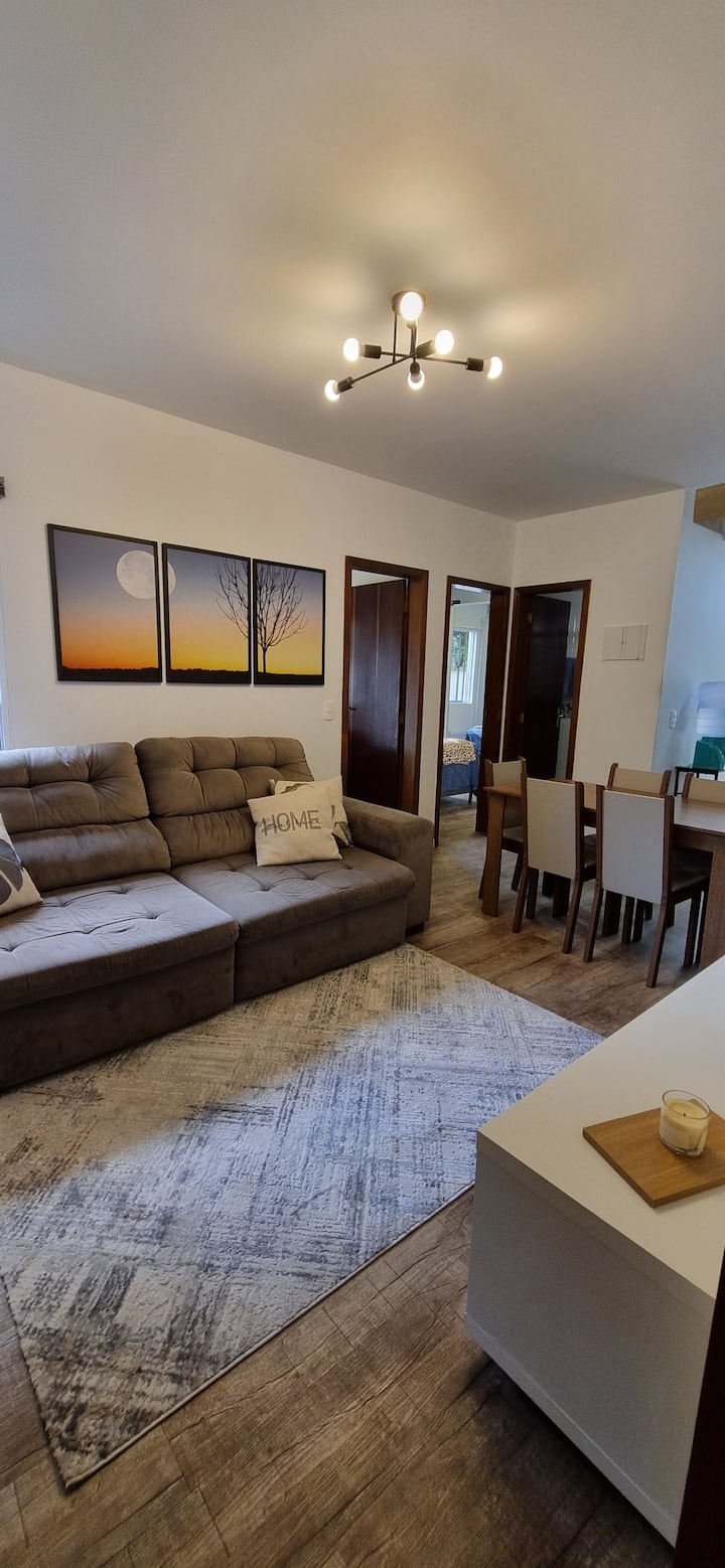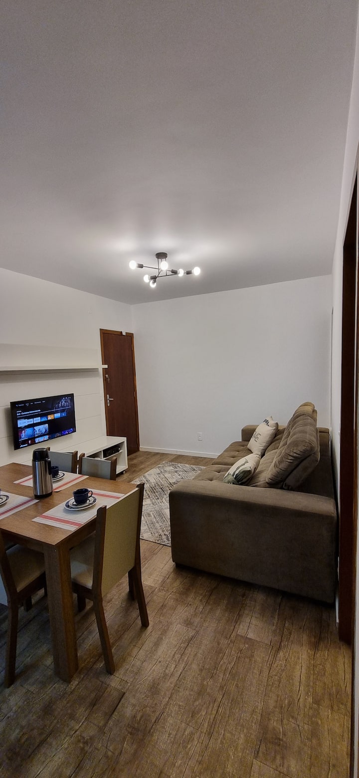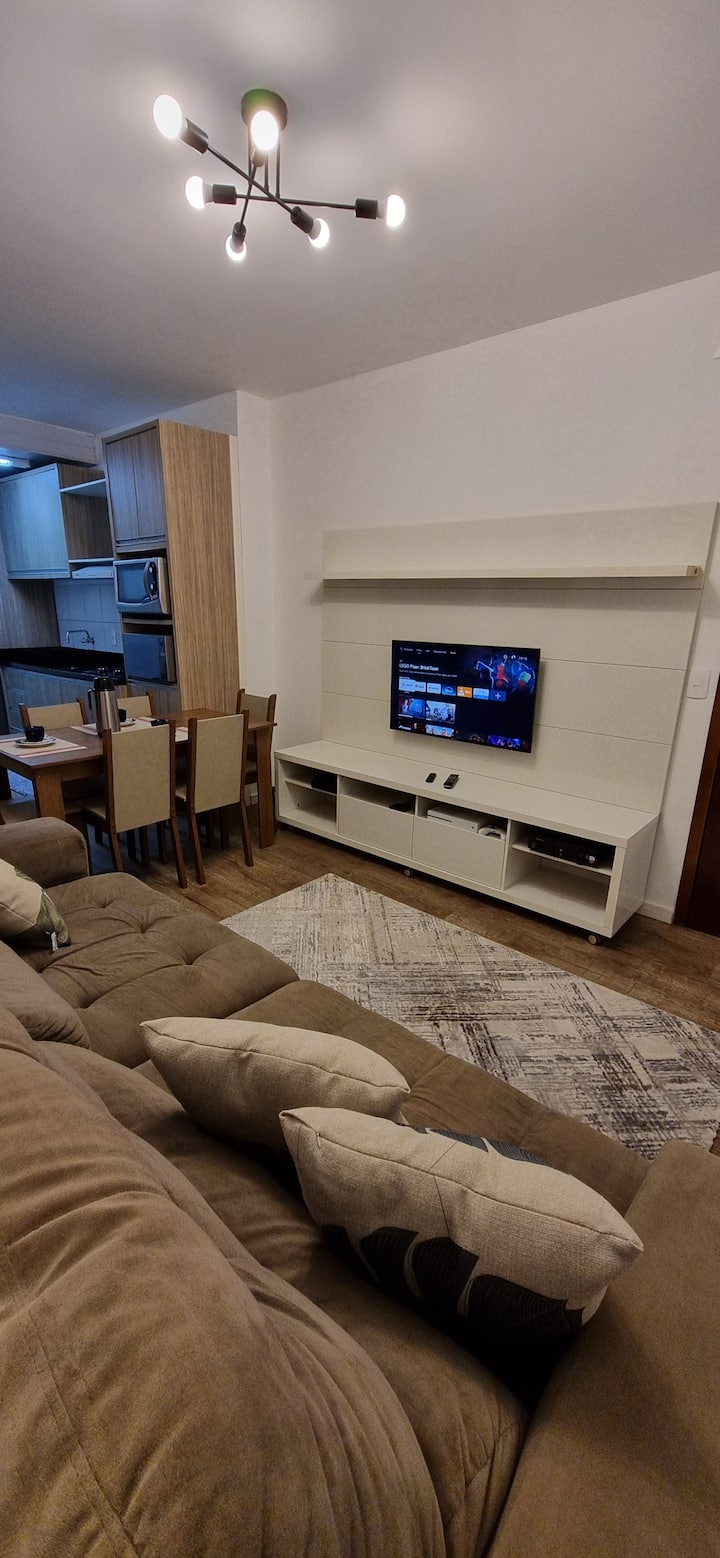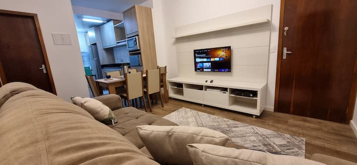 Sala with large sofa, which will accommodate several people, rack with 40”TV, TV box with channels and movies, internet access of 350 Megas, as well as video game consoles (classic Xbox w/ 3 controls and Xbox One S) and a basic Windows notebook for use.