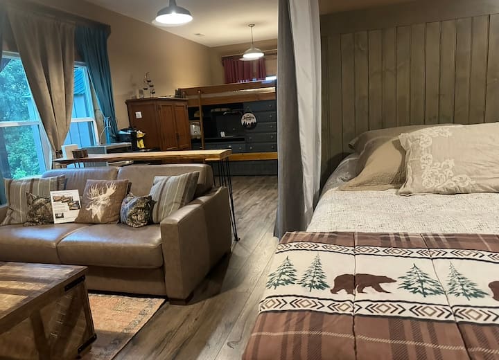 Lower level efficiency unit is 900 Sq Ft | queen bed in cozy alcove, leather sofa folds out into additional comfy foam queen bed, Smart TV, fridge, microwave, Keurig coffee maker, washer/dryer, separate shower with pull-down seat and toilet/sink areas, back deck with grill| and amazing Blue Ridge Mountain views!