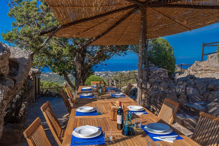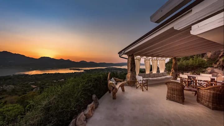 The PANORAMIC TERRACE, besides being the Beating Heart of the Villa, was built with impressive Millennia-old Sardinian Granite Stones. It is furnished with Sofas and Cushions, a Stone Table with "director’s" chairs, and Hand-carved Benches imported from Thailand. This area is the ideal spot in the house to admire Spectacular Sunsets that fade over the Sea horizon.