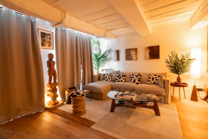 This very pleasant apartment perfectly combines the historic charm of the Marais and the artistic atmosphere of the vintage galleries of the 3rd arrondissement. Each room has been designed to offer comfort and functionality, with plenty of storage spaces. The room is on the courtyard which ensures total silence and has a comfortable bed of 160 cm, ideal for a good night's sleep. The living room, bright and welcoming, is equipped with a smart TV, just like the bedroom. The authentic decor, with heathered dishes, creates a unique and warm atmosphere, while the dimmed lights add a cozy touch. A true haven of peace where you feel good, right in the middle of Paris.