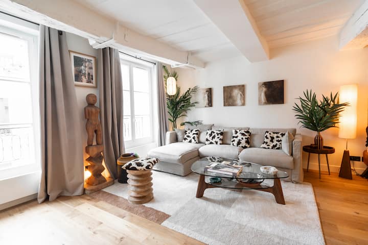 Beautiful renovated apartment in the heart of the Marais, rue Charlot, close to the Café Charlot and the Marché des Enfants Rouges. Nestled on the 3rd floor without an elevator, it combines Parisian charm and vintage bohemian atmosphere, with a bright living room, exposed beams, wooden flooring and coconut decor. Its central location makes it the ideal place to discover Paris. A real favorite for lovers of the Marais and authentic Paris!