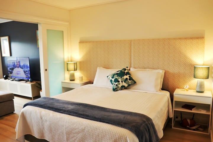 BEDDING: This unit features 1x bedroom (comfy King Bed) with frosted glass sliding doors which enter to the lounge area.