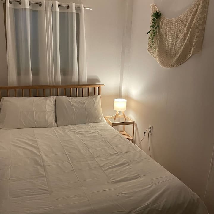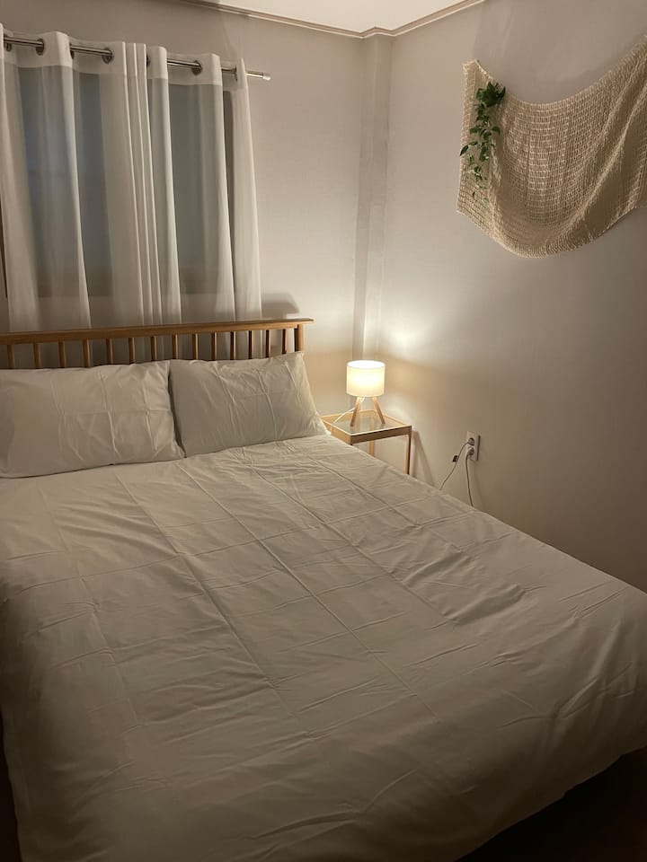 Hotel-style bedding, air conditioning, heating, blackout curtains