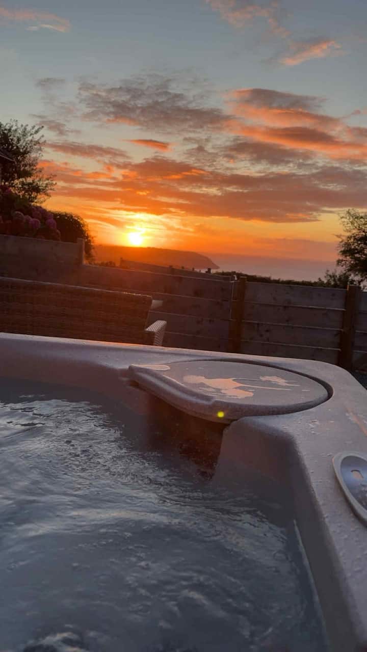 The hall opens to the outdoor decking and garden, offering stunning views of the sea and countryside. Unwind in your private hot tub—the perfect spot to watch the sunset over the water.