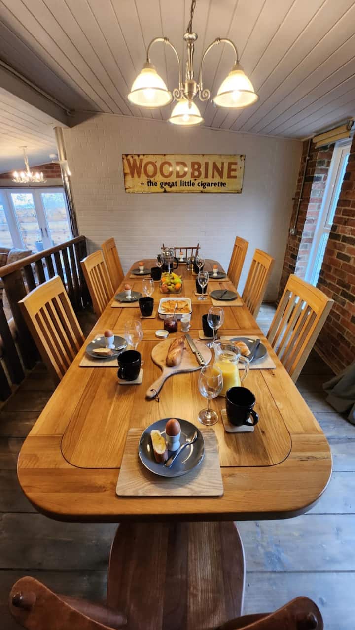 Just two steps from the kitchen, with a handy handrail, is the spacious lounge. Featuring a 65-inch TV, log burner, and a large oak dining table for eight, it’s ideal for family dinners, games, or get-togethers. A side unit stocked with glasses—including plastic ones for the hot tub—doubles as a convenient drinks station. Patio doors provide direct access to the garden, giving you multiple ways to enjoy the outdoor space.