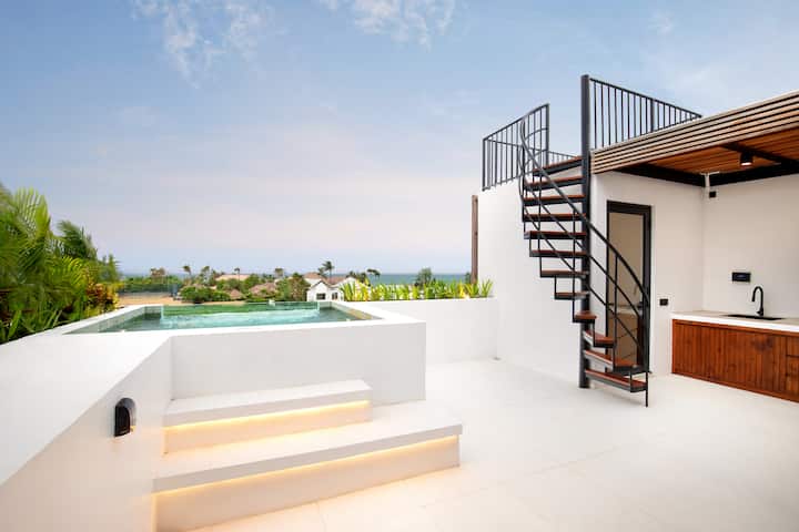Step into a world of refined elegance at Aquamarine Villas III. The enclosed , air-conditioner living area are designed for both relaxation and entertainment. Enjoy a fully equipped kitchen with high-end appliances and large dinning room and comfortably seats eight. Unwind on luxury suites, each featuring a private en-suite bathroom with a walk-in shower. Spacious rooftop balcony with plunge pool facing the ocean.