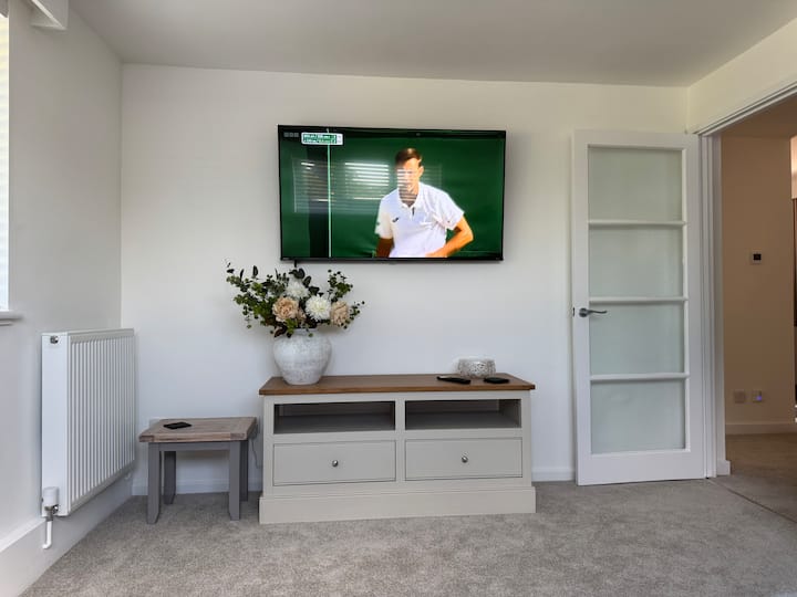 Plush king-size bed, luxury bedding, rainfall shower heated floor & mirror, 55” TV, and equipped kitchen. Full length hanging space and lots of storage. Enjoy the countryside: just yards from 175 acres of ancient woodland, historic racecourse, pub, church.