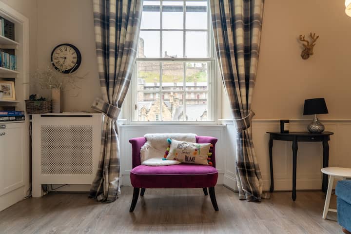 Climb our spiral staircase of 54 steps to our cosy 1 bedroom apartment and you will be rewarded with a view extraordinaire! You can't help but be impressed with the stunning view of Edinburgh Castle. Enjoy a glass of wine or a cup of coffee looking at the view of the castle, any time, any season! Look at our special rates for stays of a week or more!
