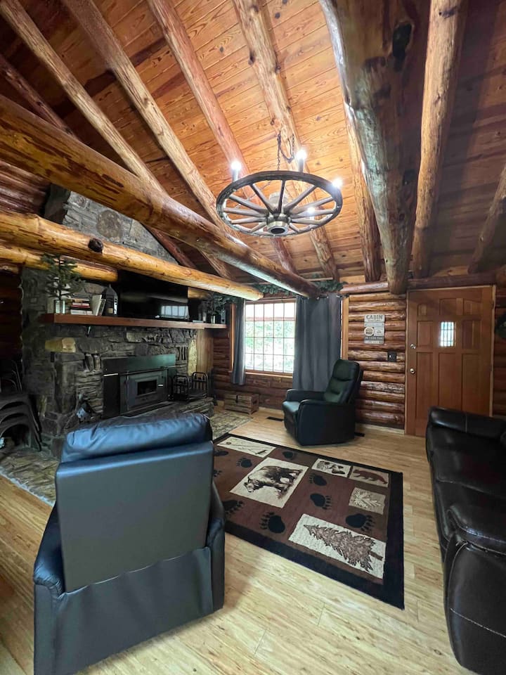 The open beamed cabin is uniquely decorated with the comforts of home. A beautiful rock fireplace is a lovely focal point containing a wood burning stove.