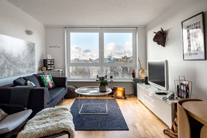 Welcome to the Cleveden Den (Apartment 6C) - a functional and warm urban haven. There are two lifts which carry guests to the 6th floor. The Den faces the fabulous west and is therefore flooded with light. There are views across the city to the hills beyond. Relax in the cosy bedroom with its kingsize bed, white cotton & linen furnishings, blackout blind and homely decor. A second, single temporary bed can be set up in the walk-in cupboard if required (please request if needed). New double-glazing keeps the rain and wind at bay as well as providing sound-proofing. On warmer days, the large living room windows can be pulled open wide, to bring the outside sunshine into the room. New wall-mounted heaters provide comfortable heat throughout. Virgin media provide a TIVO package, including internet access. The new kitchen and bathroom are modern and clean. Toiletries are provided incase guests forget any necessary items. Robes and an abundance of white towels, offer an additional luxurious touch. Have the choice of having baths or showers. There is a compact dining table with 4 chairs and the kitchen is well stocked with the pots, crockery and utensils required to cook dinner. There are laundry facilities and storage for clothing in the hall cupboard and within the bedroom. Easy to use appliance guides have been created to make living in the apartment easy. There is safe bike storage in the basement where the bins are located. A high chair and travel cot is available, if required.