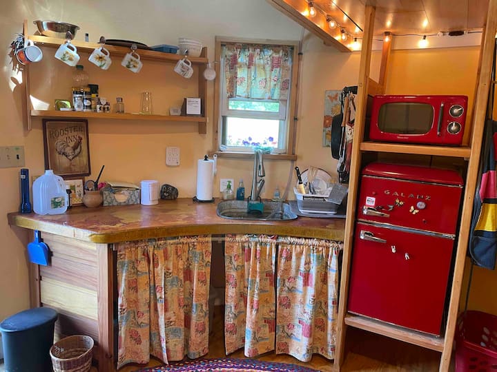 The kitchenette has a sink with running (non-potable) water, a window looking out onto the prairie, dish soap, hand soap, sponges, pots and pans, dishes and silverware, a plug-in hot plate, toaster, coffee maker, hot water heater, towels, napkins, and a few spices and condiments if you want to cook a meal.