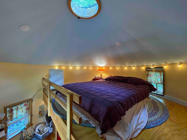 The lofted bedroom includes a Queen-sized mattress, sheets, and blankets with a portable A/C, fan, window, skylight, and room for luggage.