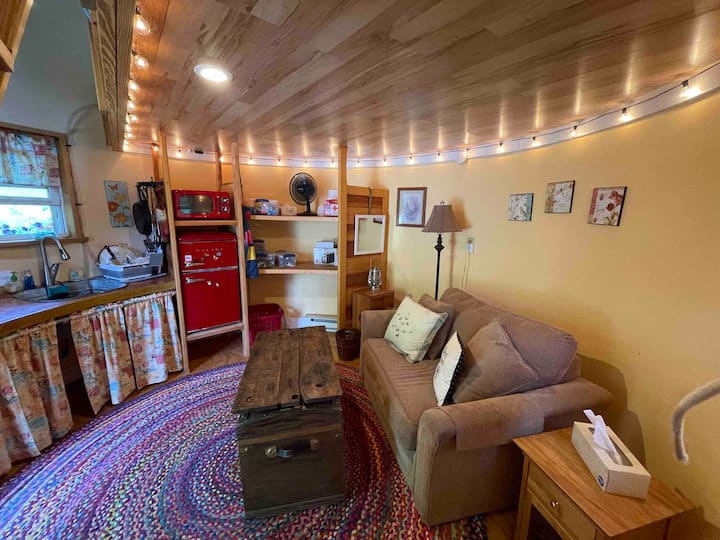 The inside of the Grain Bin is essentially a one-room tiny house equipped with everything one would find in a full-sized home.