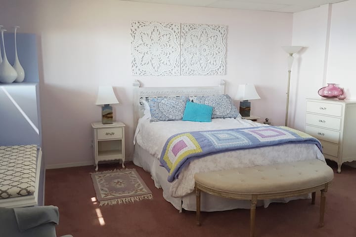 Our 12 acres overlooking Osoyoos has a million $ view. The 1100 sq. ft apartment has: private entrance, kitchen, 2 bdrms, 2 dining areas, 2 living rms and a deck all wrapped up in tasteful Moroccan decor with a Bohemian twist.