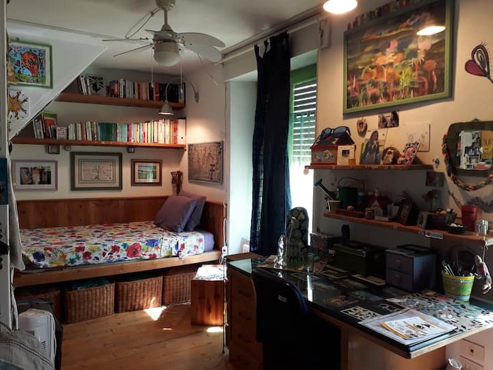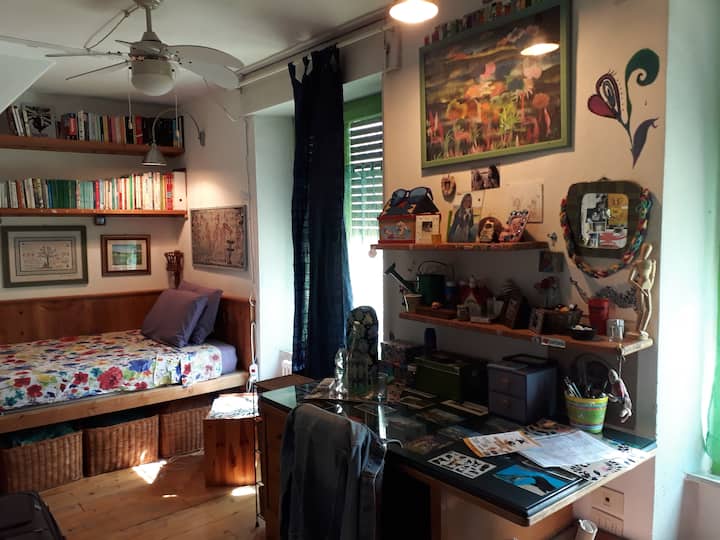 Cozy blue bedroom and priv bathroom in my home.French doublebed 140x190 cm,wardrobe,desk, kettle,wi fi,smart tv 24",ceiling and vertical fans, air conditionning In spacious,vintage, full of atmosphere apartm. Kitchen use in common with any other guests and owner. In old town, pedestr. area. Railway /bus station 15' away.Bus stop at 5'.Car parks at 3'-5'.Close cafè,pubs,restaurants,pizzerie,shops,supermarket,banks,touristic office, monuments,old churches,museums,theaters,library