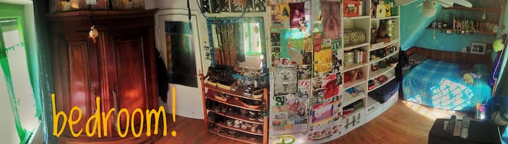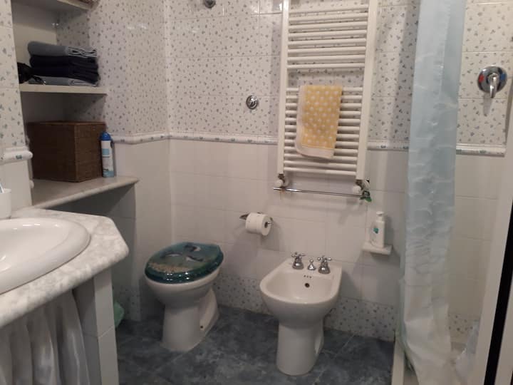 THE BLUE ROOM WITH PRIVATE BATHROOM IS LOCATED IN MY HOME. THE ENTRANCE RESERVED FOR GUESTS ALLOWS DIRECT ACCESS TO THE SLEEPING AREA OF THE HOUSE, WHERE THE BLUE BEDROOM IS LOCATED. THE ROOM IS BRIGHT, QUIET AND SPACIOUS ENOUGH . IT HAS TWO WINDOWS WITH SHUTTER AND MOSQUITO NET. THE ROOM HAS A COMFORTABLE FRENCH DOUBLE BED (140 X 190 CM) THE ROOM ALSO HAS A WARDROBE, A SPACIOUS WRITING DESK, A KETTLE, A SMART TV 24". THE BLUE ROOM HAS A CEILING AND A VERTICAL FAN AND AIR CONDITIONING. HEITING WITH RADIATOR. IN THE WHOLE FLAT THERE IS A WIRELESS CONNECTION. THE PRIVATE BATHROOM IS NOT IN THE ROOM, BUT CLOSE TO IT