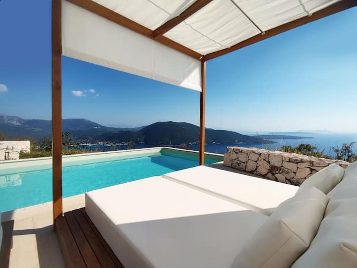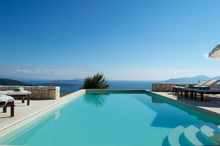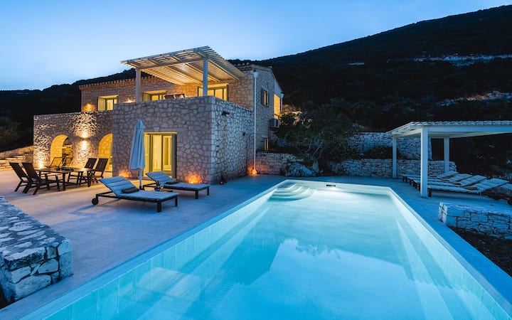 Urania Villa Helios has been crafted with absolute love. Helios has private pool, 3 spacious bedrooms with en-suite bathrooms (1 with Jacuzzi bathtub), 1 stylish main dining area, 1 kitchenette with a conversable sofa (1.40x2.00) and an extra WC—a fully equipped kitchen and comfortable patios to enjoy your meals in front of the stunning Ionian sea.
