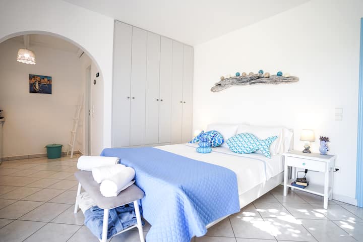 (GR): My parents were born in Paros, and my first trip many many years ago was on this island. Since then, wherever I traveled, I haven't found any destinations more charming. When my husband and I decided to build this “house”, as we say on our island the cottages, we did it with a lot of love and passion. We spent a lot of time becoming a haven of peace and relaxation for us, our children, and our friends. We planted trees and flowers and saw them grow, especially our bougainvillea which is the queen of our garden. We wanted to share this shelter through airbnb so that the