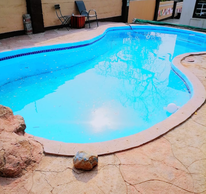 The entire property is securely enclosed with a screen wall and electric fence, ensuring peace of mind for all guests. There is ample free parking available within the premises and a beautiful swimming pool for guests to relax and unwind.