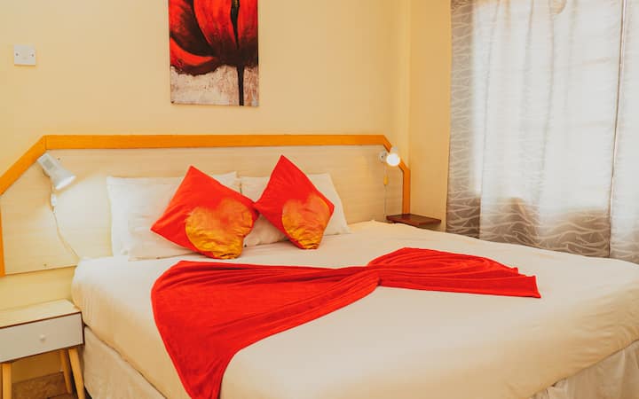The main block features three bedrooms. Two are ensuites, each with private bathrooms, while the third bedroom has its own private toilet located just outside the room (not shared). The block also includes a spacious living room and a fully equipped kitchen. This is ideal for self-catering guests or families who prefer a home-style setting.