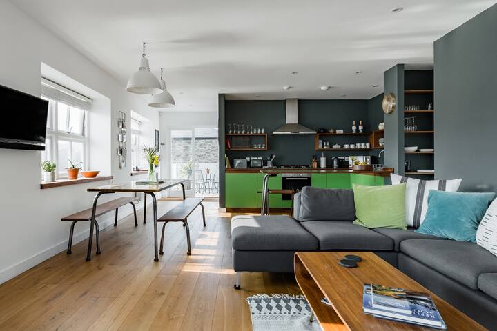 But what about the apartment you ask? Well, it’s an open plan living room, kitchen with outlooks across the estuary to die for. Newly furnished in an eclectic, very chic style - those of you who love a mix of modern, retro and a bit of global will certainly be excited about the look.