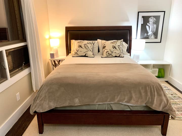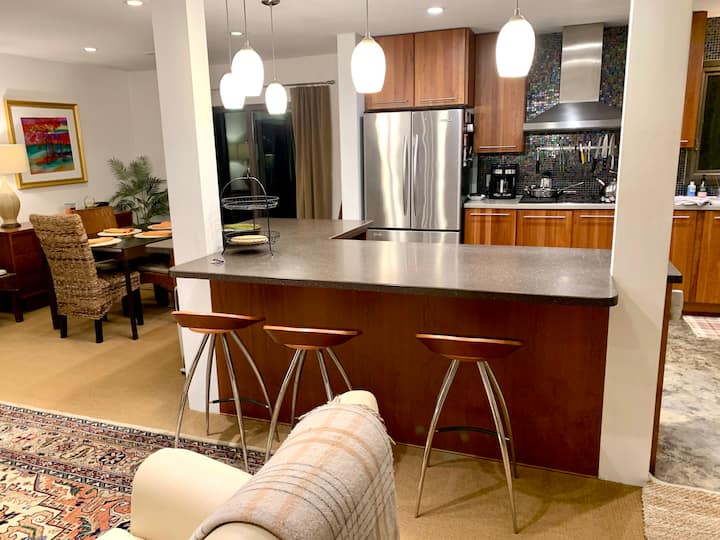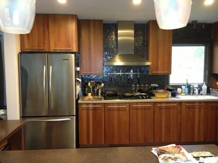 This rental has been very popular on Airbnb, with great reviews. Spacious and bright 1400 sq ft separate private apartment upstairs in house. There is another separate apartment downstairs, where I live. It is completely nicely furnished with linens and all utilities, TV, strong wifi. Terrific well-appointed Kitchen with Gas Range, Professional Hood Vent, Dishwasher, RO filtered water. Stocked with enough basic supplies for your first morning or two: coffee, toilet paper, etc.