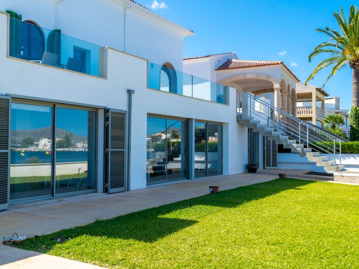 Alcúdia, Es Barcarés: Very child friendly, beautiful villa "Can Verd", 2 storeys. In the district of Es Barcarés, in the resort 4 km from the centre of Alcúdia, in a quiet position residential area (villas), traffic calmed area, 2 km from the edge of the forest, 5 m from the sea, 5 m from the beach, direct access to the beach, in a pedestrian area. Private: beautiful terraced garden with lawn, natural garden. Outdoor shower, table tennis, patio, arbour, pergola, garden furniture, barbecue. In the house: lounge, internet access, WiFi, fitness room, table tennis, playroom, storage room for bicycles, air conditioning, laundry, washing machine, tumble dryer, drying room. Parking, public car park, public parking on the road. Shop 2 km, grocery 700 m, supermarket 2 km, restaurant 50 m, bar, bakery 2 km, café, bicycle rental 2 km, 25 minute walk to the centre, bus stop 700 m, sandy beach 700 m, rocky beach 5 m, diving center 4 km, outdoor swimming pool 6 km, swimming bay 150 m, public bathing area 55 m. Sports harbour 6 km, marina 5 km, golf course (18 hole) 5 km, surf school 4 km, sailing school 6 km, tennis 5 km, riding stable 6 km, sports centre 6 km, children's playground 700 m. Please note: suitable for families, suitable for seniors. Object suitable for 10 adults groups of teenagers on request only. The owner does not accept any youth groups. Neighbourhood highly sensitive to noise. Quietness and good behaviour expected.